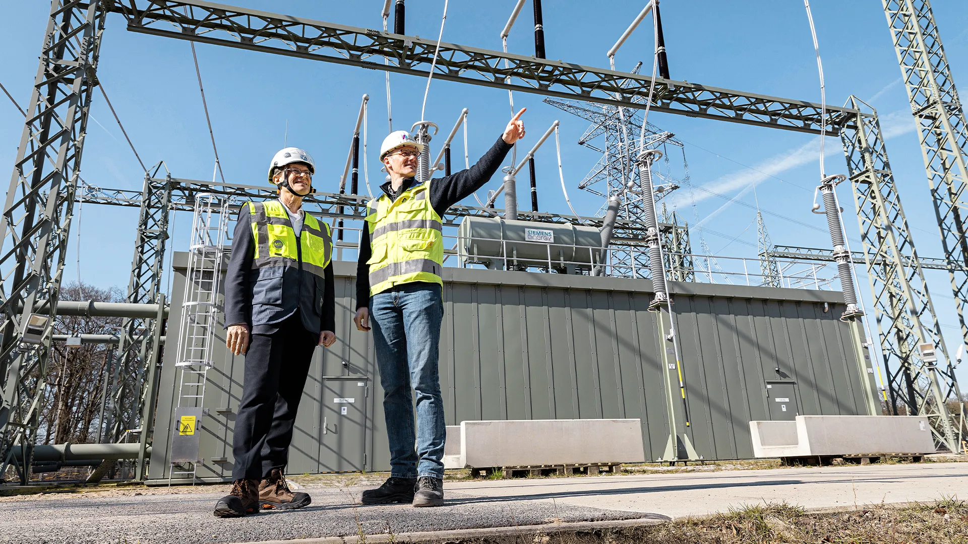 Starke Partner: Dr. Daniel Eichhoff (l.) von Amprion und MR-Geschäftsführer Wilfried Breuer direkt am Phasenschiebertransformator, der nur dank der sehr engen Zusammenarbeit beider Unternehmen realisiert werden konnte.