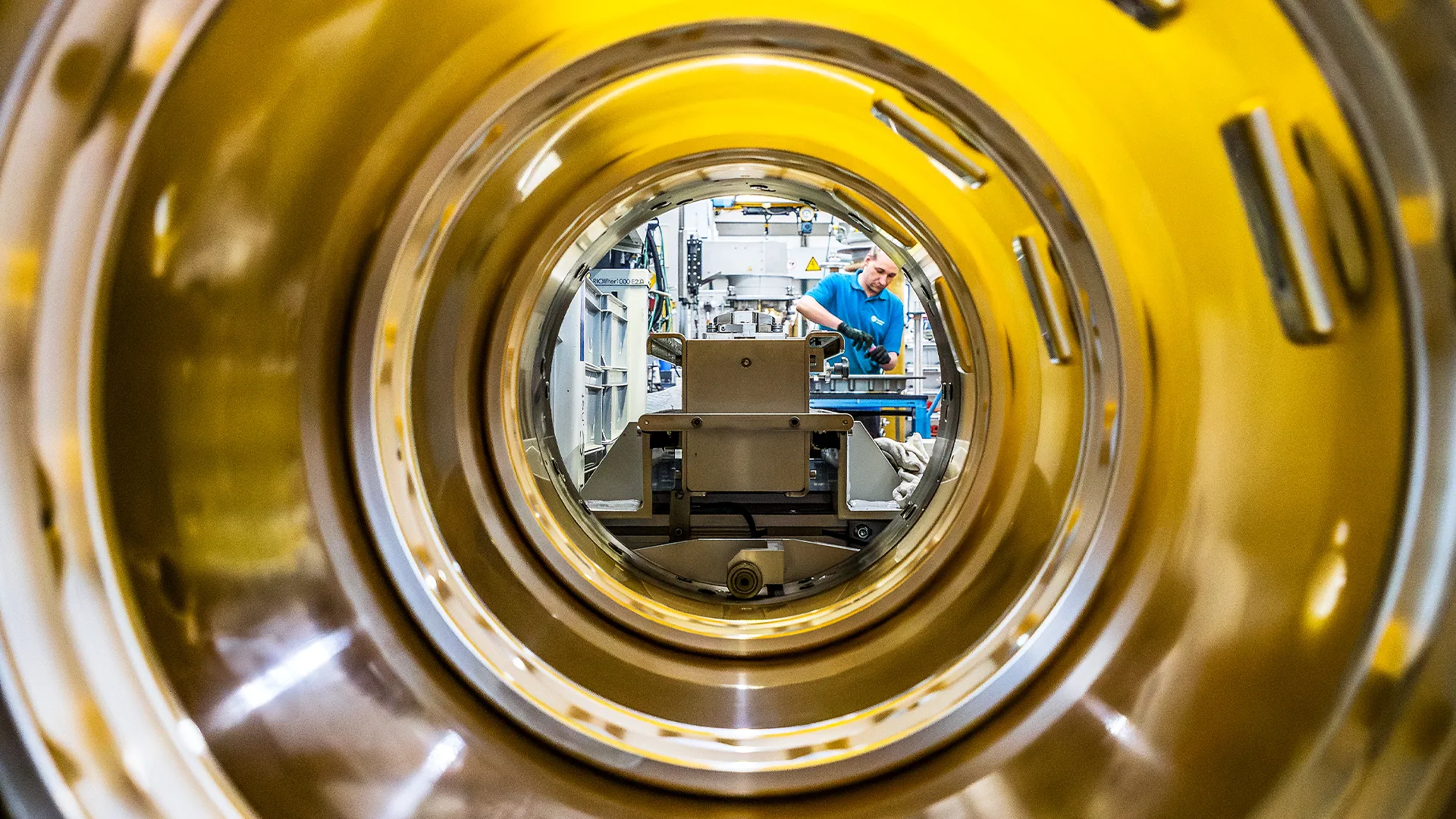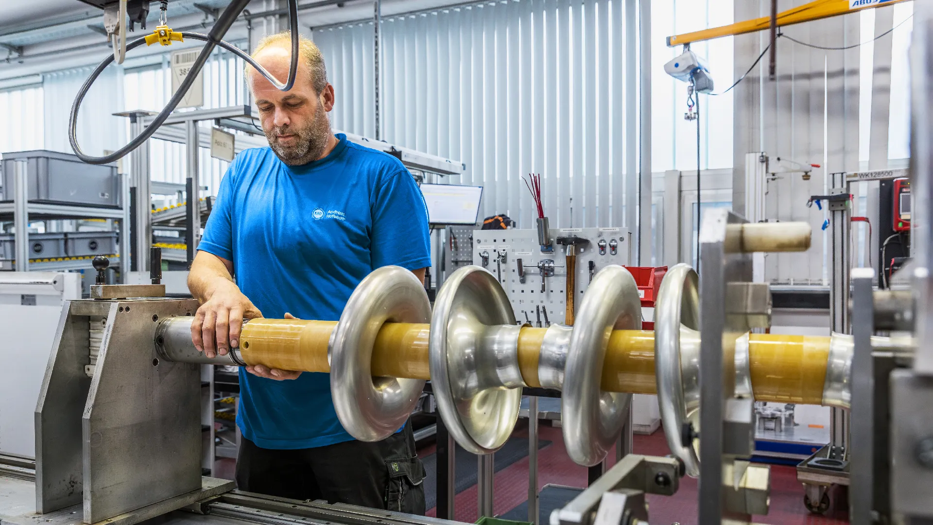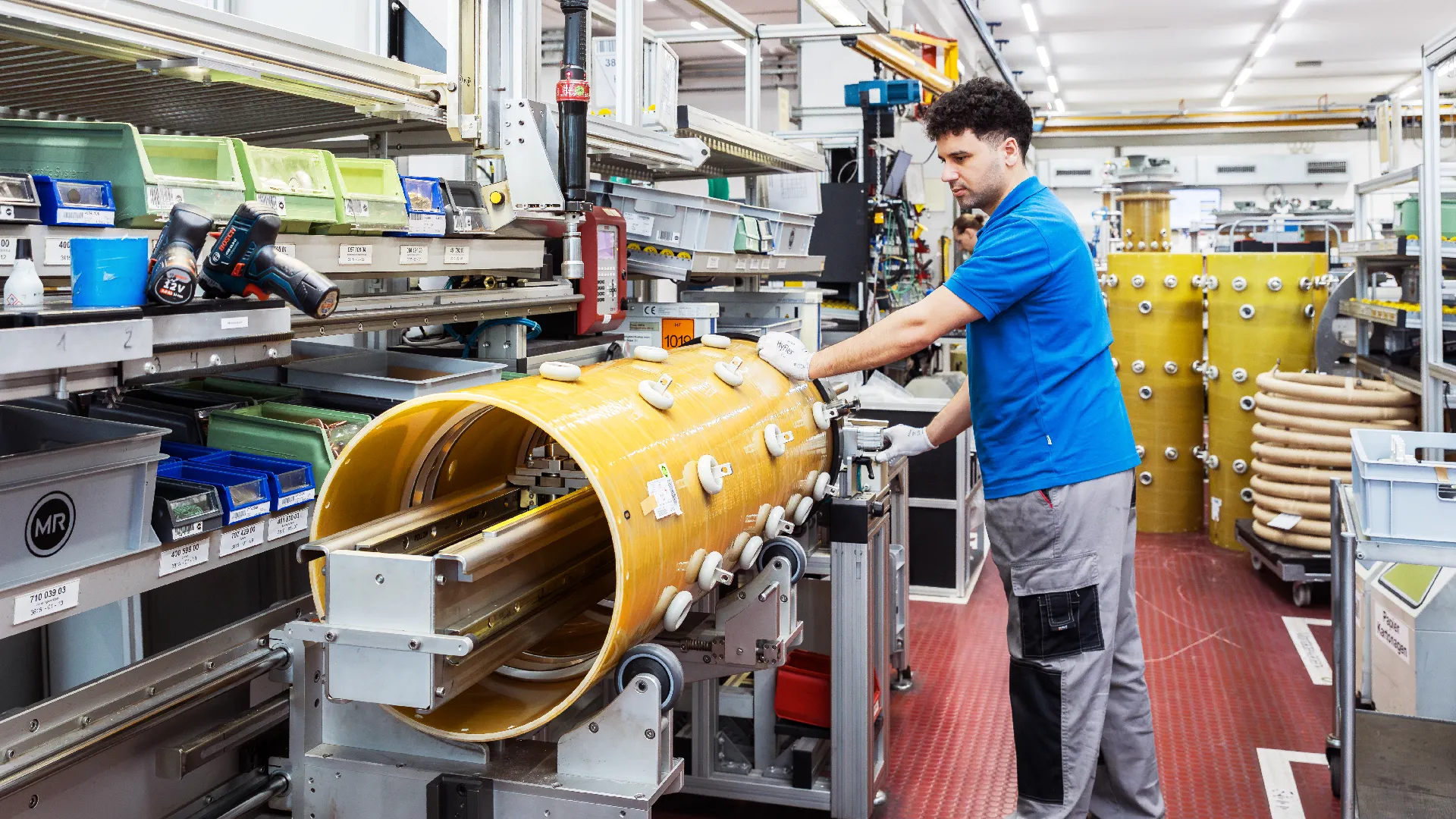 In this production step, an employee attaches the fixed contacts to the contact cylinder into which the selector switch with the vacuum interrupters will later be inserted.