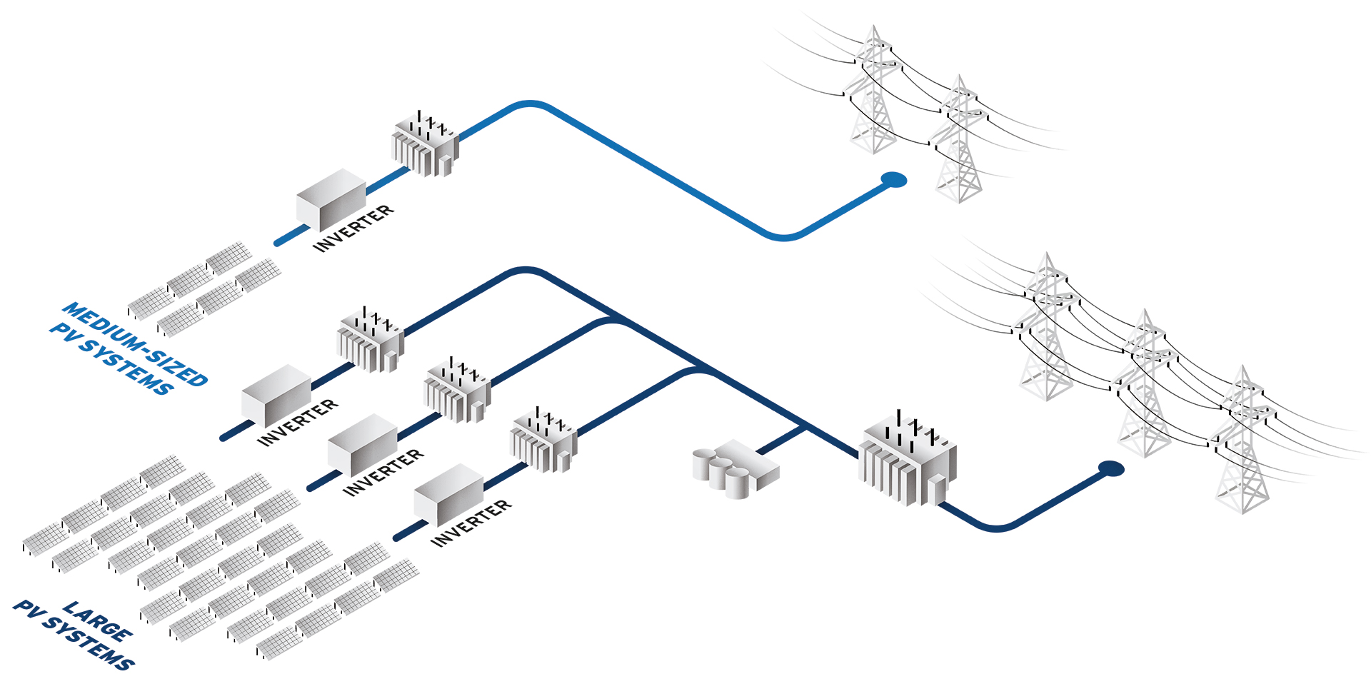 Strict grid codes, fluctuating grid voltage, and uneven solar input are challenges for medium and large PV systems. The ECOTAP® VPD® also regulates here.